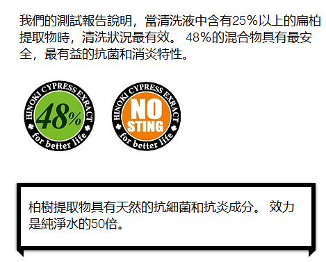 我們的測試報告說明,當清洗液中含有25%以上的扁柏提取物時,清洗狀況最有效。 48%的混合物具有最安全,最有益的抗菌和消炎特性。柏樹提取物具有天然的抗細菌和抗炎成分。 效力是純淨水的50倍。