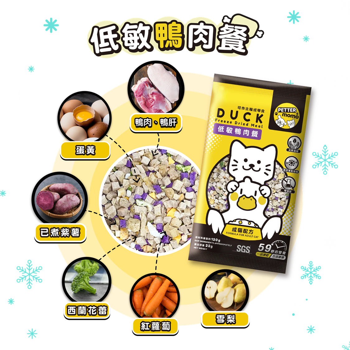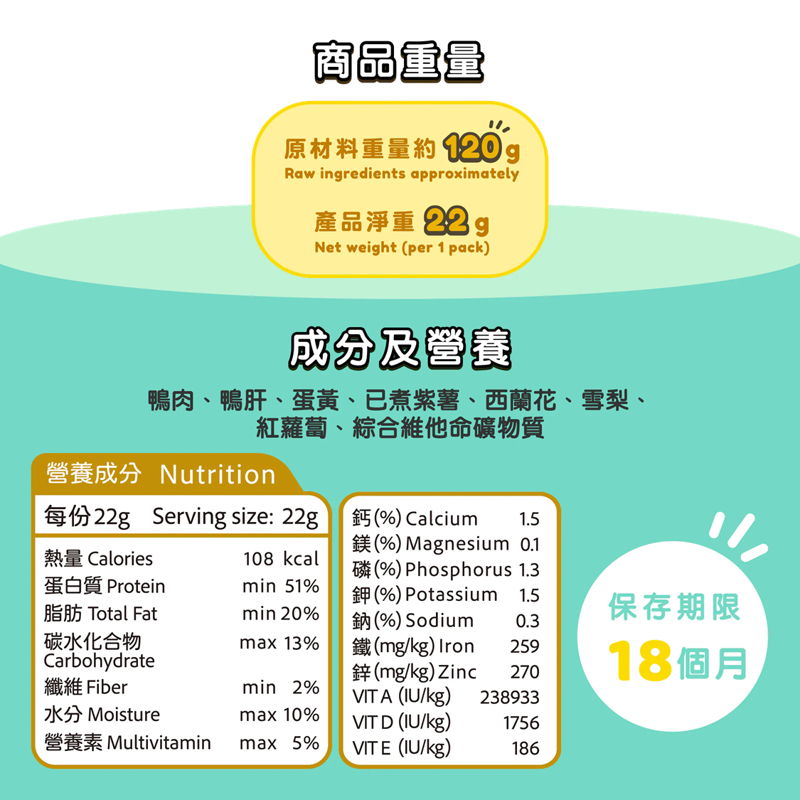 成分: 鴨肉、鴨肝、蛋黃、已煮紫薯、西蘭花、雪梨、紅蘿蔔、綜合維他命礦物質