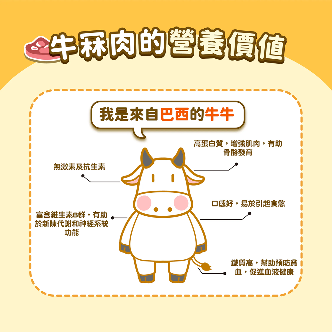 高級巴西牛冧肉蛋白質,含有豐富維生素、礦物質、牛磺酸、鐵質,特別適合需要增強肌肉的狗狗,對骨骼發育有幫助
