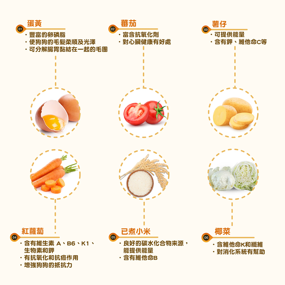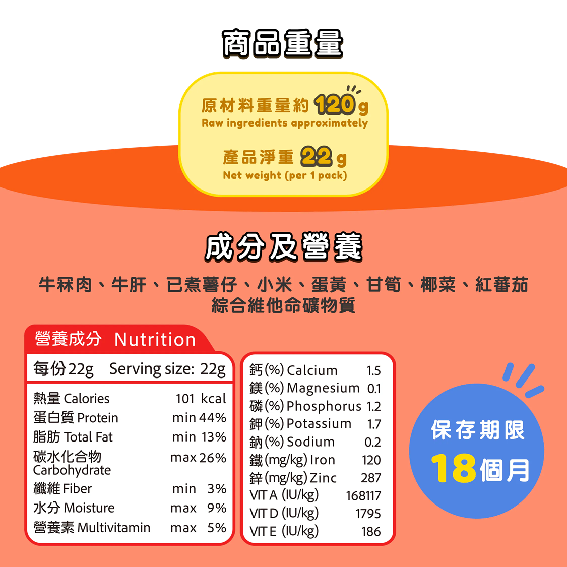 成份 : 巴西牛肉 、牛肝、紅蕃茄、蛋黃、薯仔 、已煮的小米、椰菜、紅蘿蔔、綜合維他命礦物質