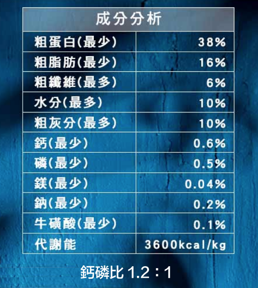 氯化鈉,dl-生育酚乙酸酯,烟酸,維生素B1,D-泛酸鈣,維生素A,維生素 B 2,維生素 B 6,維生素 B12,維生素 D3,磷酸氫二鉀,葉酸,D-生物素,硫酸亞鐵,硫酸鋅,磺酸鈣,牛磺酸,DL-蛋氨酸,天然維生素 E,迷迭香提取物,絲蘭提取物